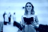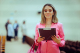 Businesswoman Holding Folder and Checking Schedule before Conference. Entrepreneur attends a business seminar reading a presentation