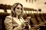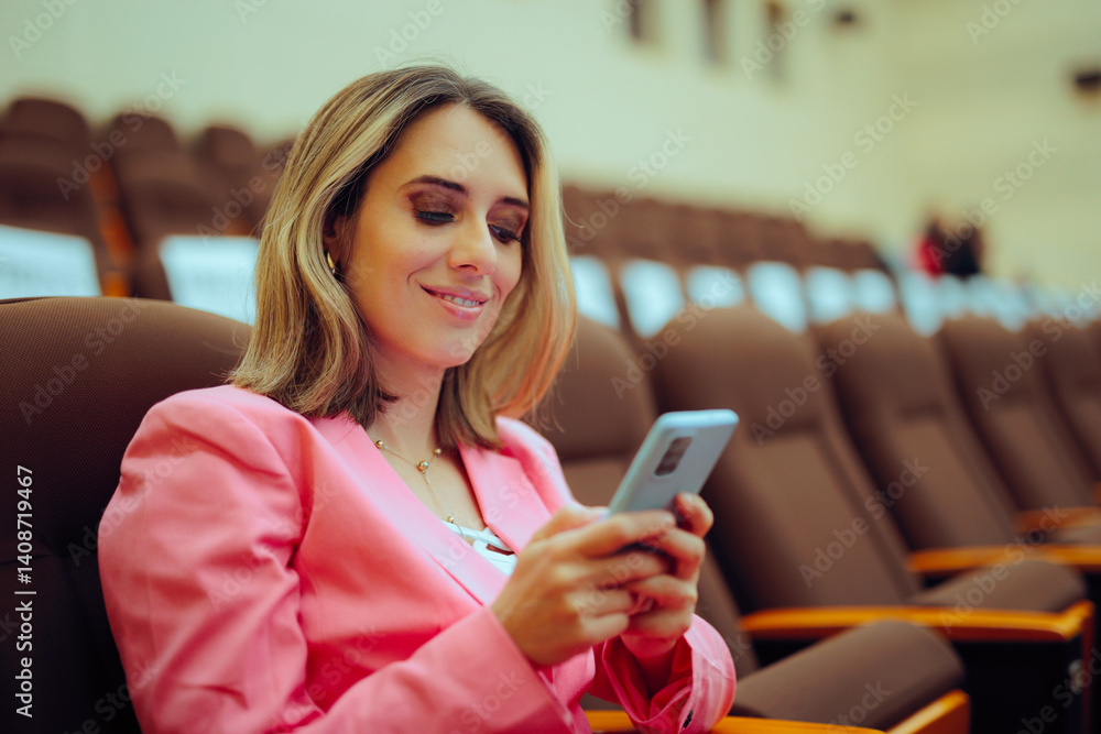 Businesswoman Reading Messages on Phone in a Conference Room. Entrepreneur uses a mobile app for stock market and trading