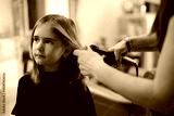 Adorable Girl in a Hair Salon Having her Hair Straighten for a Haircut. Child having her hair in a short bob hairstyle done by a professional hairdresser