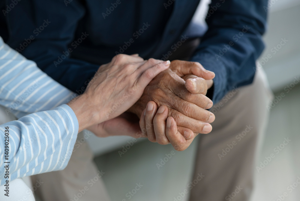 Senior couple holding hands for love, care and trust in home, connection and motivation for mental health.People, comfort and partner for help with kindness, bonding and support for grief.