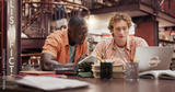 Students, men and together with laptop at library for group project, research and education at university. People, computer and review with books, calculator and learning for scholarship at college
