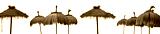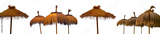 straw beach umbrellas isolated on white background, tropical thatched beach umbrellas