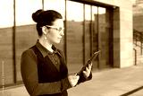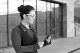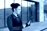 Businesswoman entrepreneur standing on the city street background. Female manager holding digital tablet computer using software applications.
