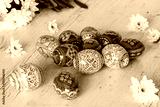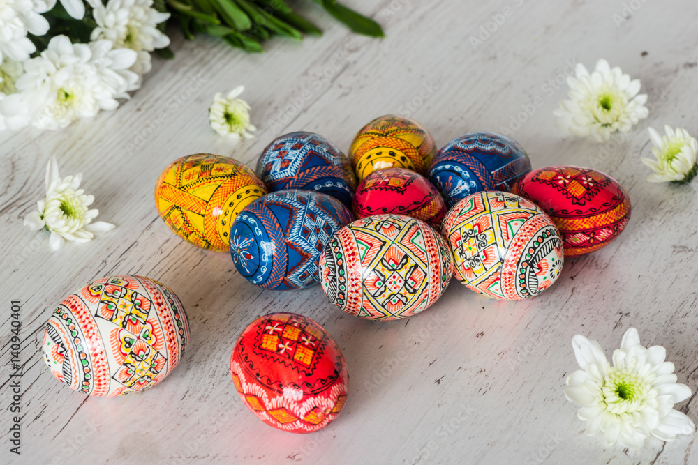 Easter Background with easter eggs and spring flowers on light wooden background
