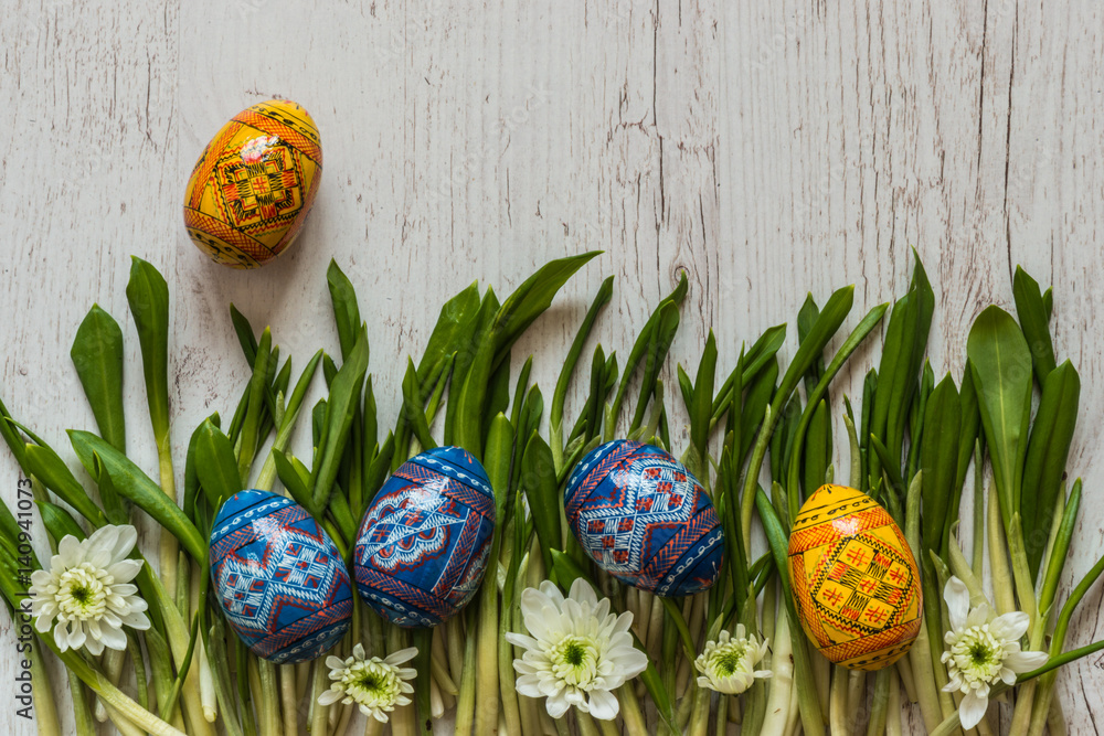 Easter Background with easter eggs and spring flowers on green grass