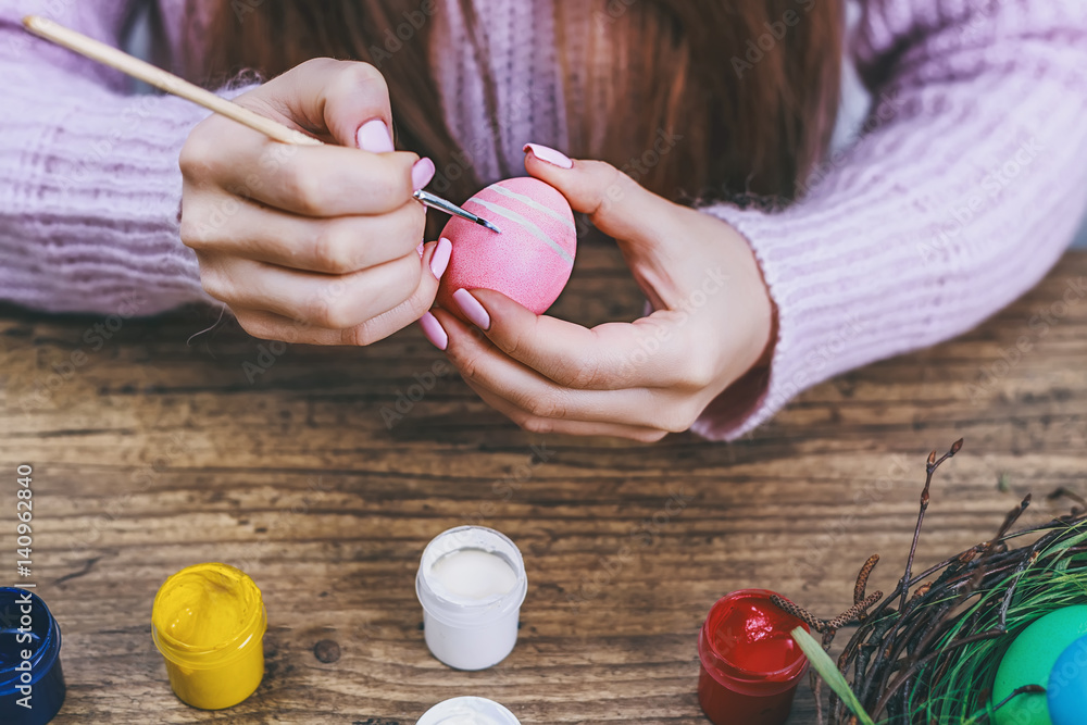 Female hands painting Easter eggs on wooden table. Toned picture.