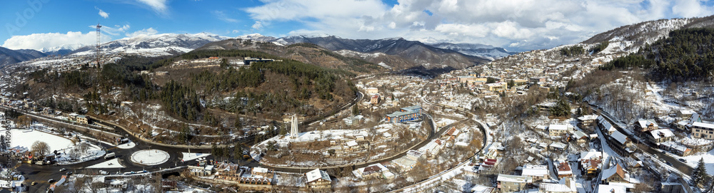 Panorama Armenia. Winter Dilijan. Armenia view from quadcopter. Houses on slopes of mountains in Dilijan. Panorama of Armenia as seen from drone. Travel to Dilijan. Cityscape in cold winter weather