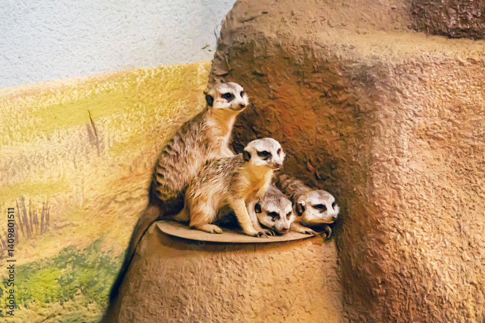 A group of Meerkats (Latin Suricata suricatta) sitting on the edge of a cliff on a clear sunny day. Animals are mammals of zoos.