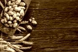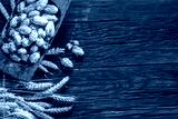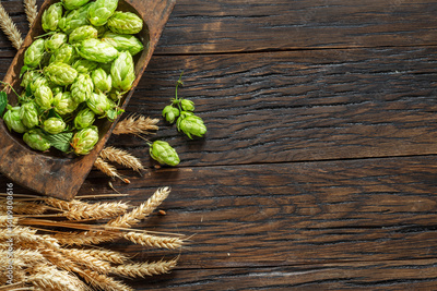Fresh green hops or hop cone flowers and ripe golden wheat ears on wooden table. Top view.