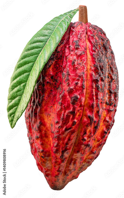 Red cocoa fruit with green leaf isolated on white background. File contains clipping path.