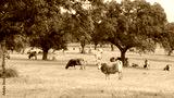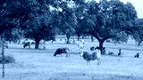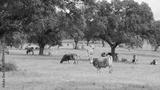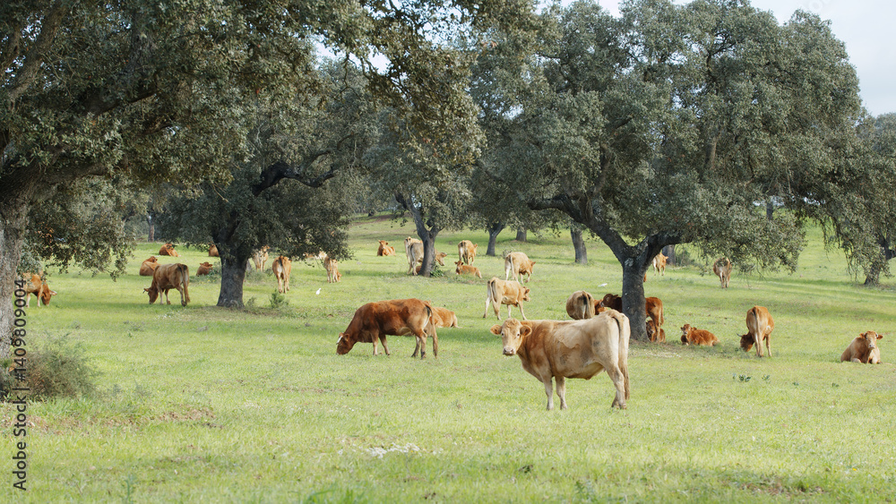 Herd of cows grazing in the meadow between green trees in spring or summer day.