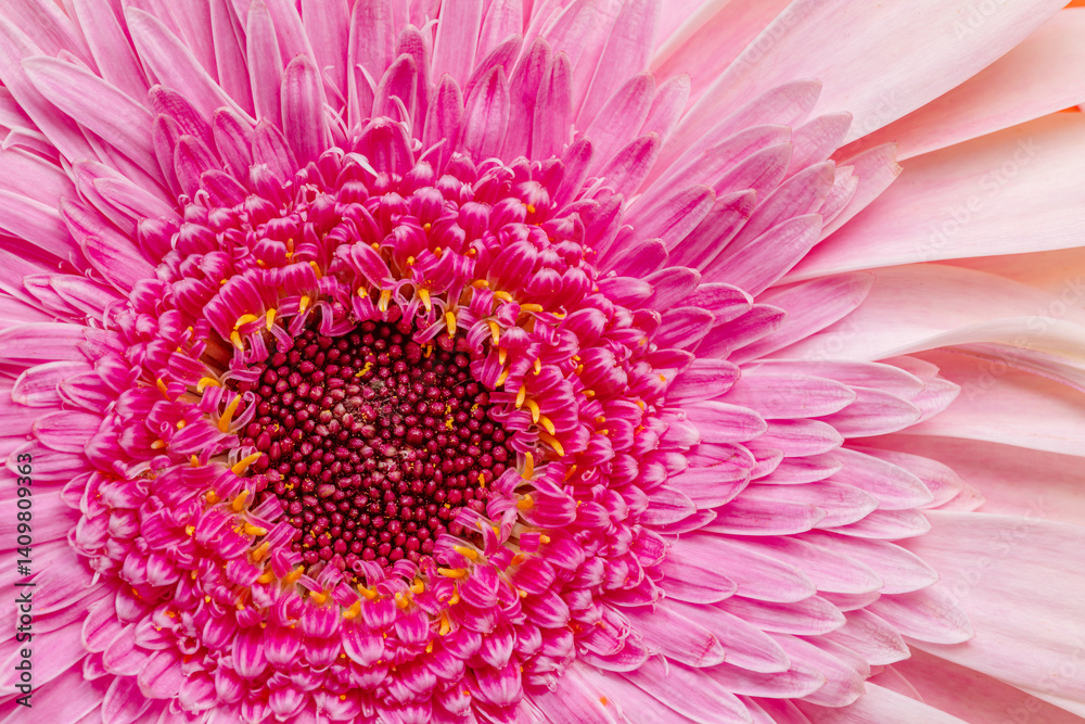 Delicate pale pink gerbera flower with a bright pink center, close up.