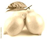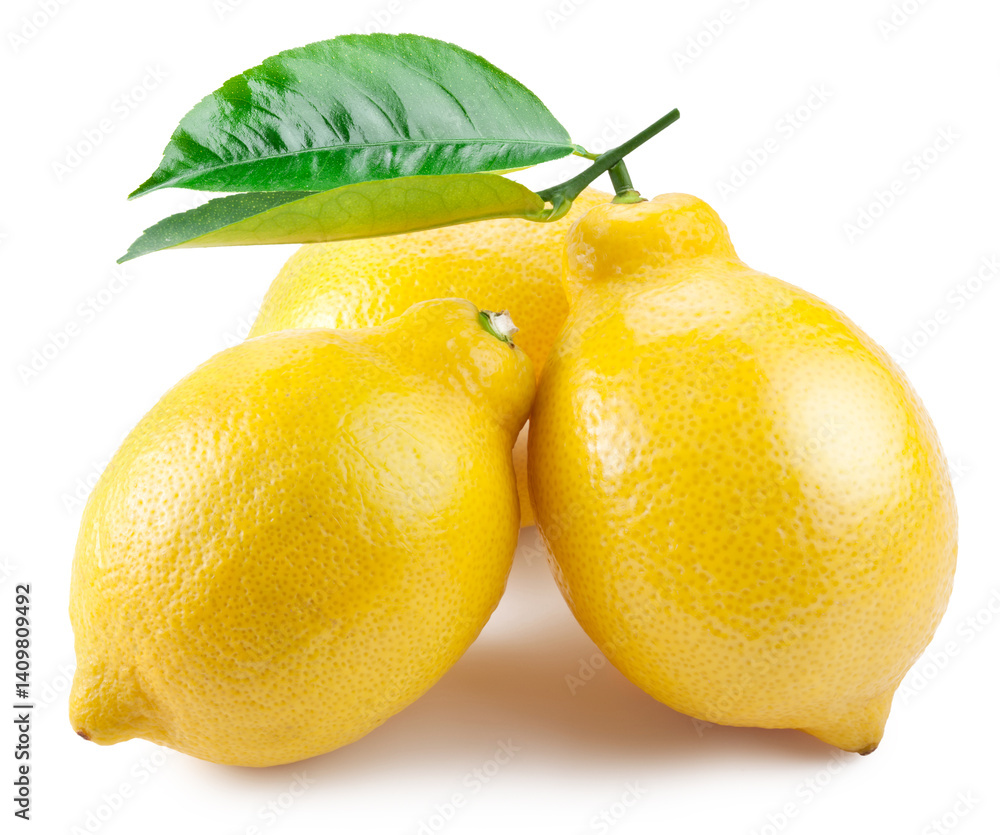 Ripe lemon fruits with green leaves isolated on white background. File contains clipping path.