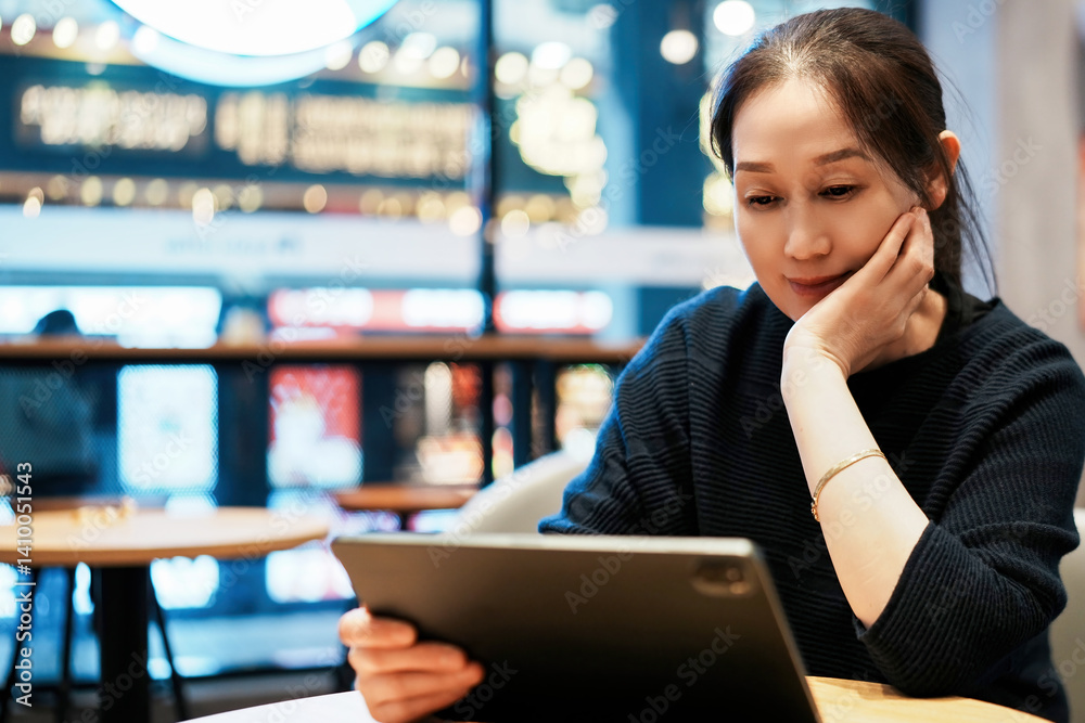 Engaged Woman Using Tablet in Trendy Coffee Shop Setting