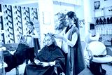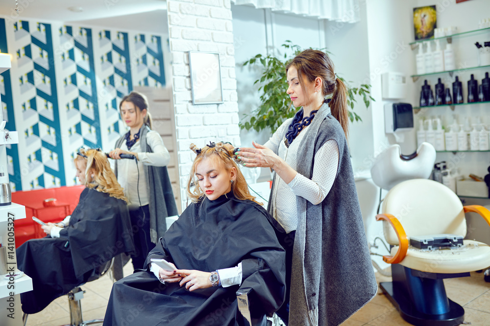 Hair styling in a beauty salon .