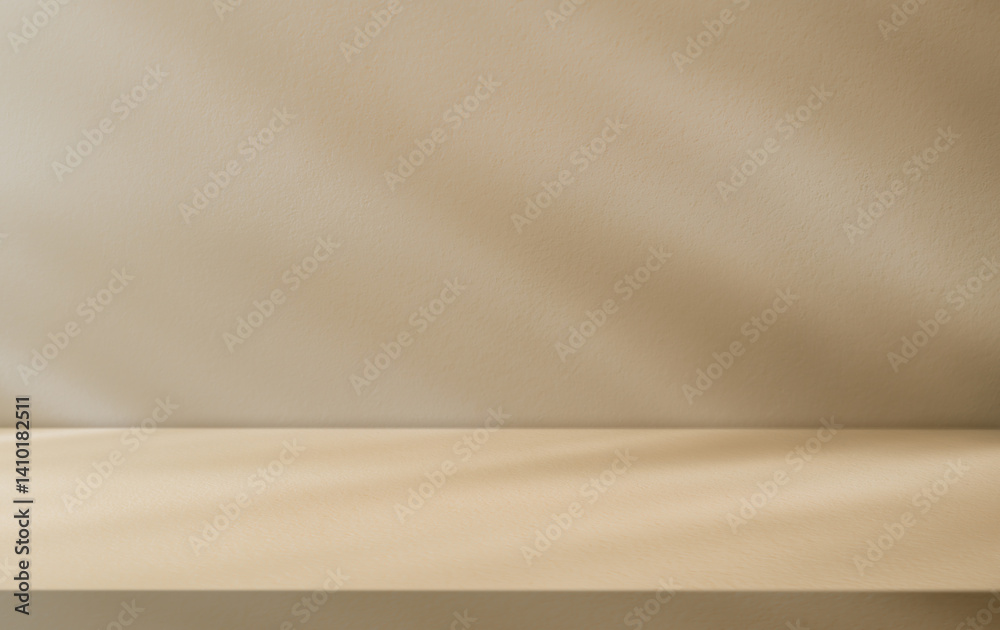 Empty beige wall cement studio background and floor shelf, Brown wall interiors studio backdrop well design display product advertising