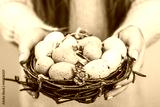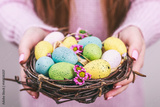 Woman hands holding painted easter egg in a small nest. Toned picture. Selective focus.