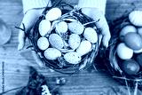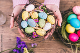 Woman hands holding painted easter egg in a small nest. Toned picture. Top view. Selective focus.