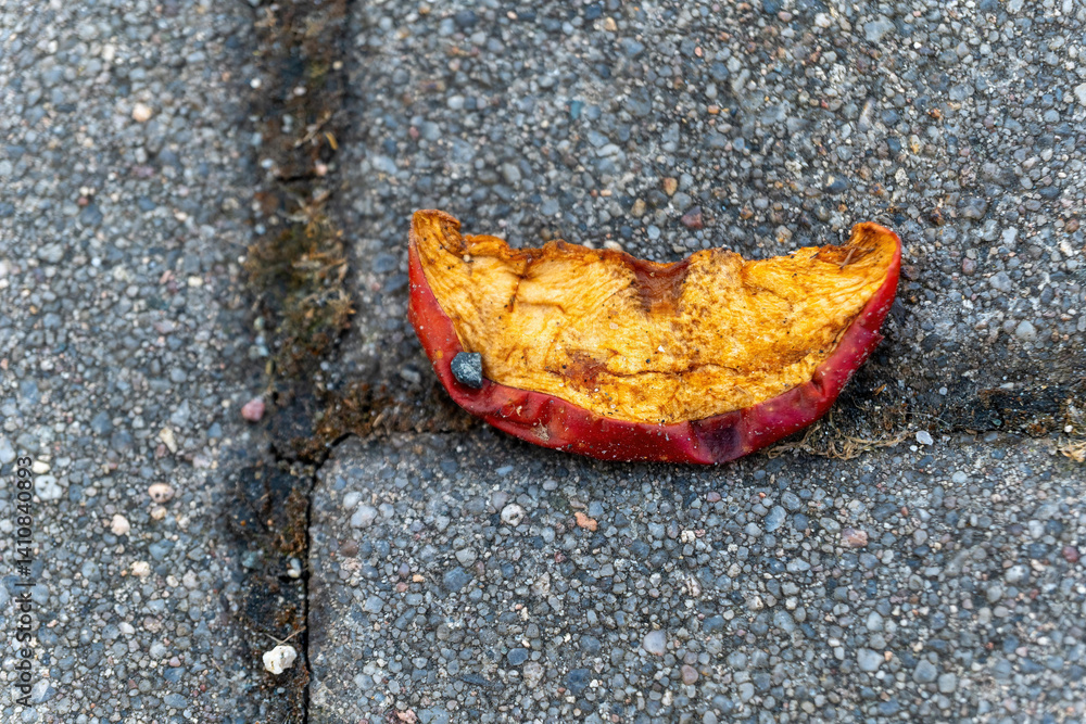 Old apple slice on pavement tells a story of time and change in a bustling urban environment