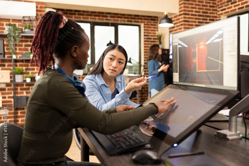 Black female employee sits at desk, updating her asian creative manager on latest progress of the project. Professional women editors collaborate on startup design, sharing ideas in brick wall office.