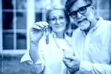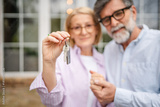 Happy mature couple hold a house key, stand in front of their new home