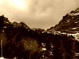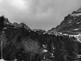 Dense pine forest stretches through a snow-dusted Tatra valley surrounded by dramatic rocky peaks partially hidden by low-hanging spring clouds