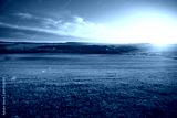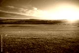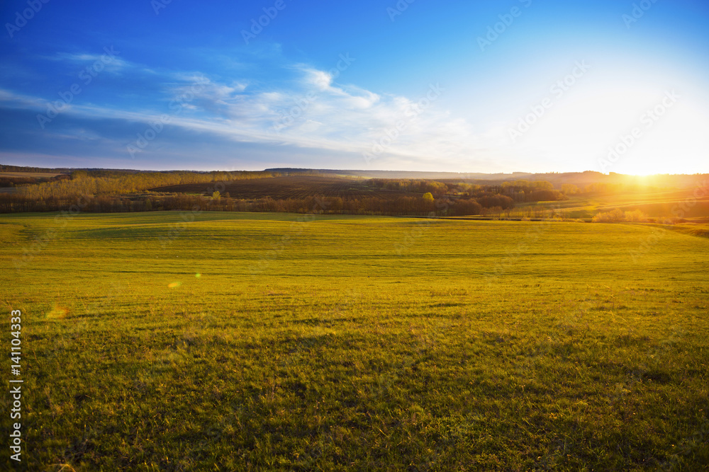 Field of spring grass on sundown. Spring meadow on sunrise.