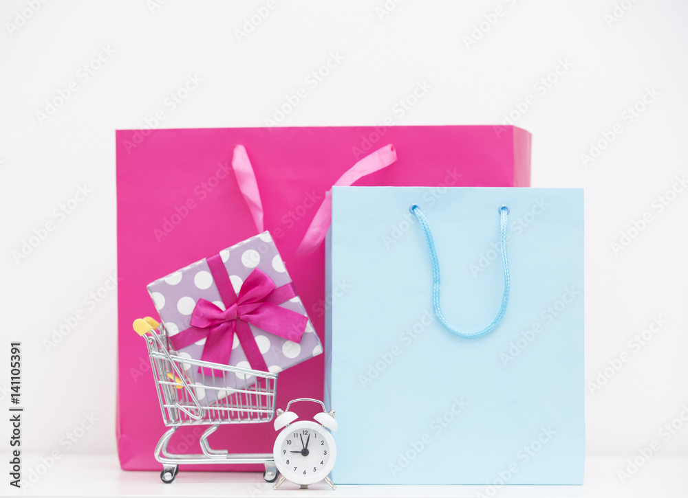 cool shopping bags, gift in shopping cart and alarm clock on the wonderful white background