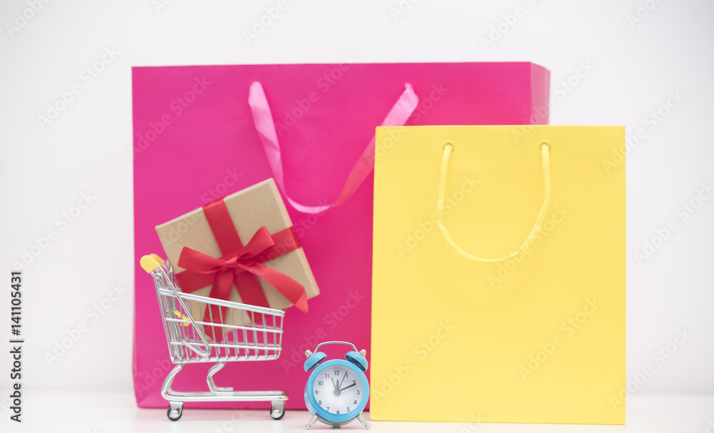 cool shopping bags, gift in shopping cart and alarm clock on the wonderful white background