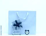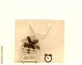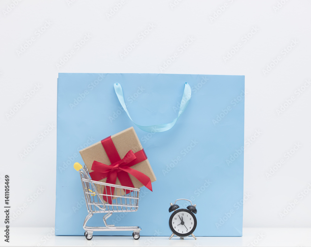 cool shopping bag, gift in shopping cart and alarm clock on the wonderful white background
