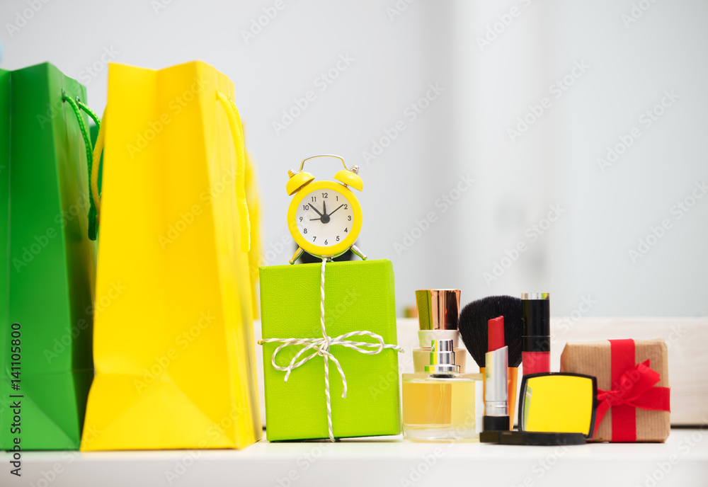 cute shopping bags, make up set, gifts and alarm clock on the wonderful mirror background