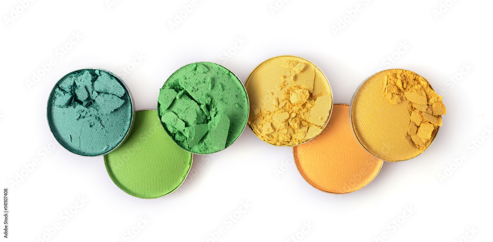 Round yellow and green crashed eyeshadow for makeup as sample of cosmetic product