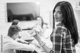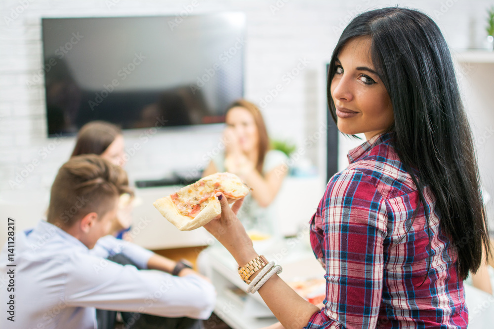 Young woman eating pizza with her friends at home.