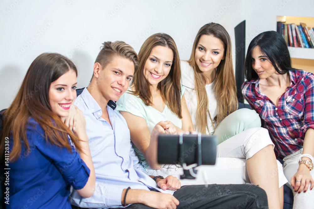 Group of friends taking selfie using selfie stick at home.