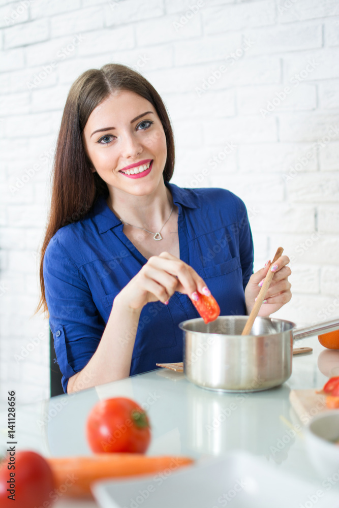 Young brunette woman cooking in the kitchen.
