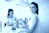 Young smiling woman cooking in kitchen. Her sister cutting vegetables in the background.