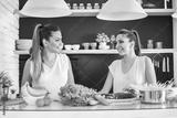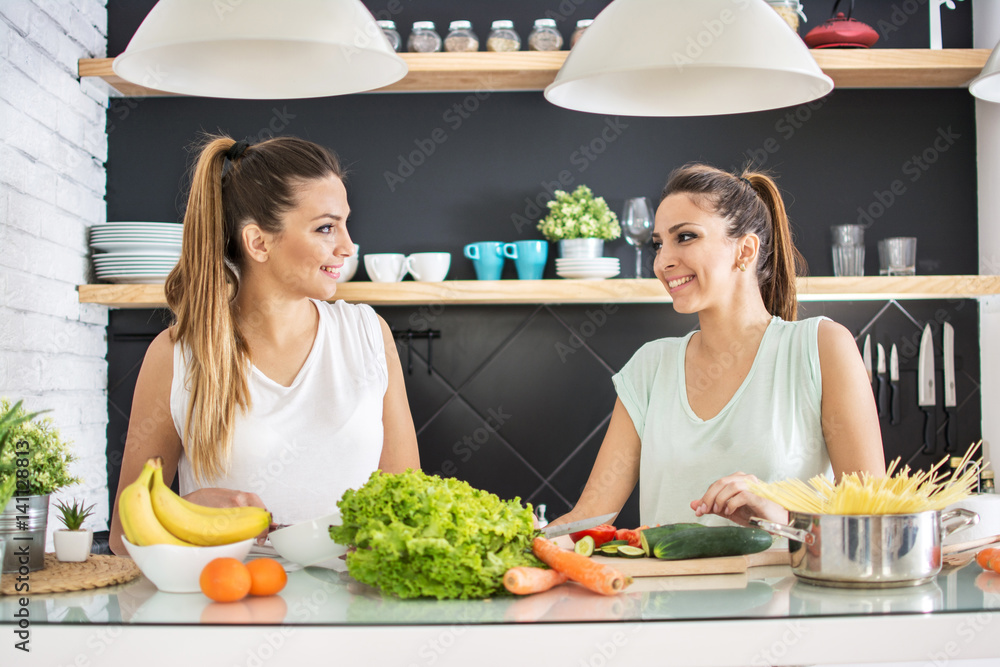 Happy young twin sisters preparing organic vegetables salad for lunch together in the kitchen.