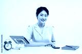 Cheerful professional woman at her desk with tablet phone and office supplies Ready to work