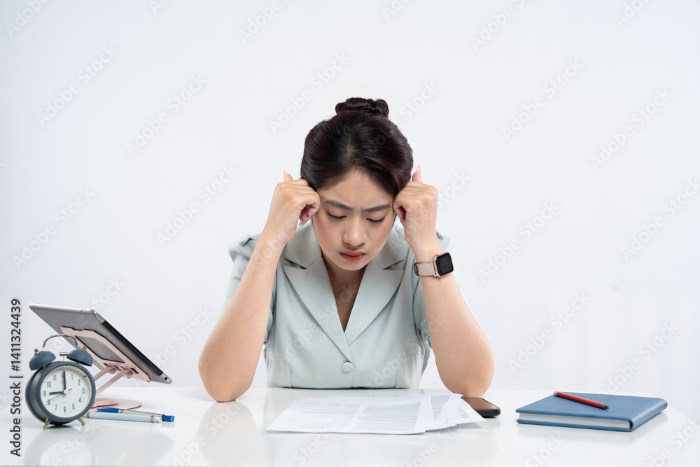 Stressed woman with hands on temples facing burnout at her desk with documents and devices