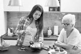 Granddaughter with grandmother cooking in the kitchen.
