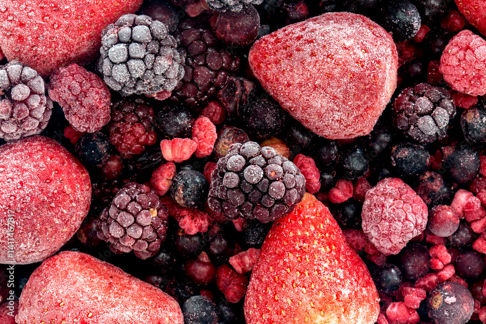 Frozen fruit assortment with strawberries, blackberries, blackcurrant and red current background backdrop. Frozen food concept.