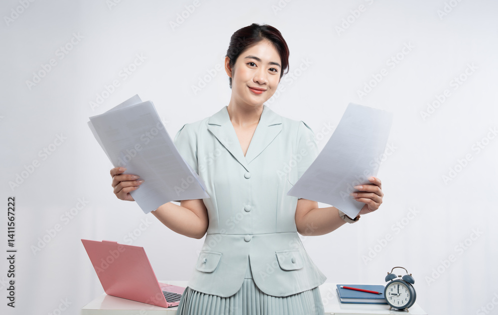 Professional woman reviews paperwork at her desk balancing work and time management skills