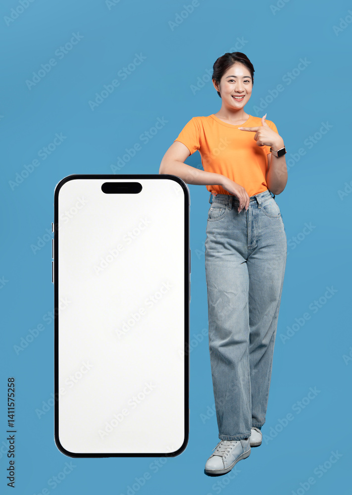 Young woman presents a large smartphone pointing at herself highlighting the user's value