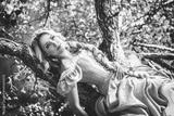 Beautiful girl with long hair braided in a braid, in corset and magnificent pink dress.