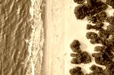 View from above, stunning aerial view of a beautiful and uncontaminated wild beach bathed by a rough sea during the sunset.