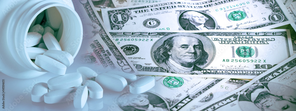 Concept of health care costs. Drug costs money. Pills and US banknotes as banner. Dollars and tablets.