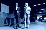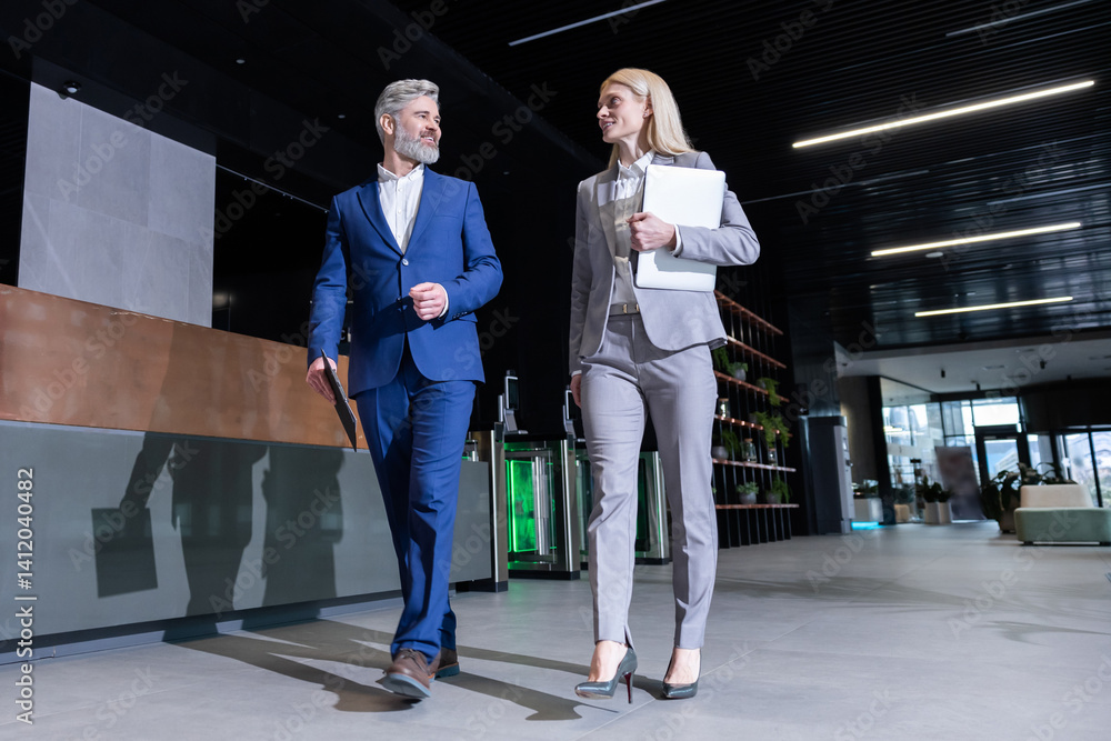 Businesspeople walking in office with gadgets and communicating about work goals