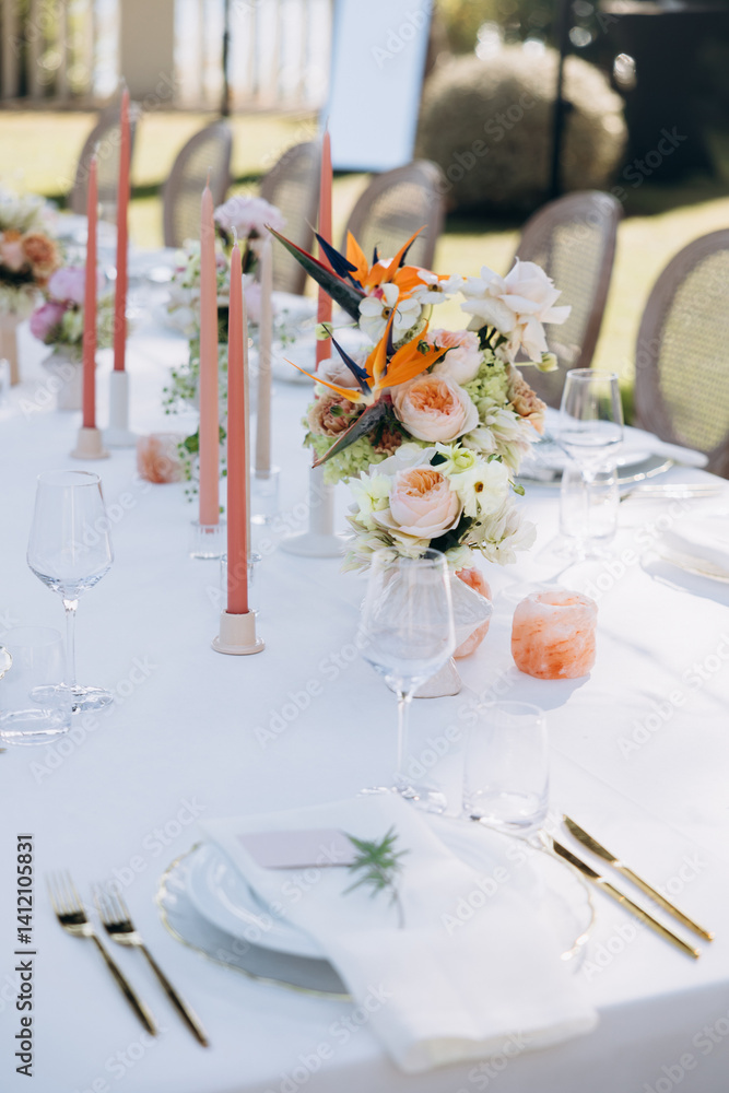 Wedding. The festive table is decorated with floral arrangements and candles.