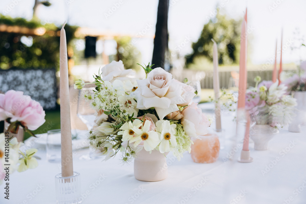 Wedding. The festive table is decorated with floral arrangements and candles.