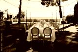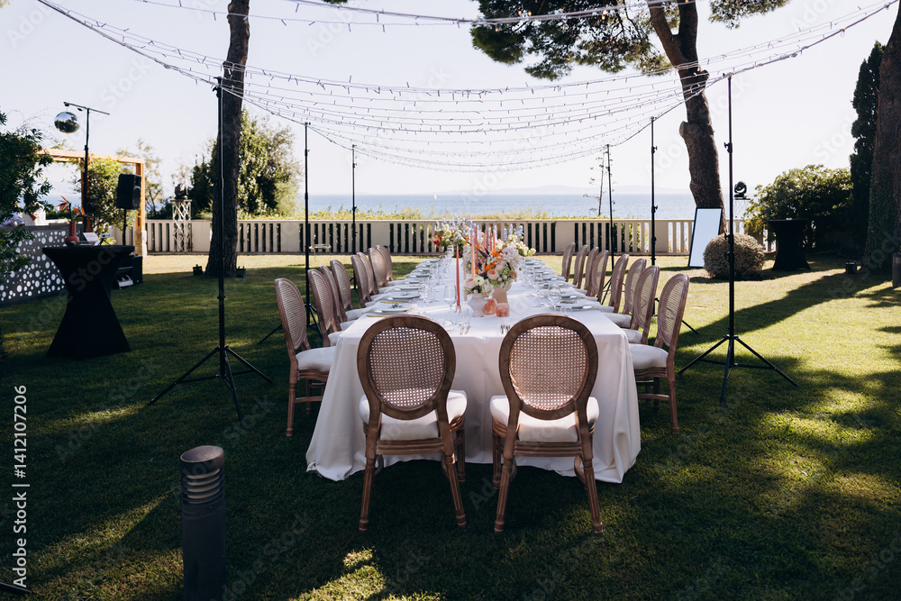 wedding. A festive table adorned with flowers and candles stands on a green meadow among the trees, with a view of the sea and the sky